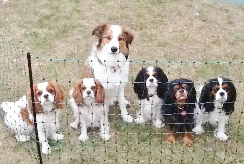 ’Uden opsyn’ går i min verden slet ikke; når jeg ikke er hjemme, er de tre bc tæver adskilt fra hinanden og de andre hunde. De kan alle se hinanden, men er i hver sit rum adskilt med børnegitter. Cavalierene har alrummet, gangen og forstuen, hvor de kan finde plads til at være for sig selv, hvis de ønsker det. På den måde opstår der ikke stress og konflikter, som ingen kan gribe ind og stoppe. Når jeg ikke er hjemme, er det sovetid, ikke rende-omkring-og-lege tid.