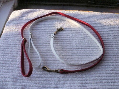 2 solide læderliner, bredde 1,5 cm, med messingkarabinhager, længde 115 cm, rød/hhv. hvid, 75.-/stk.