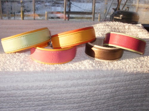5 stk. læderhalsbånd, indvendigt polstrede med lille chromkæde. kun brugt meget få gange. pr stk. 115.-