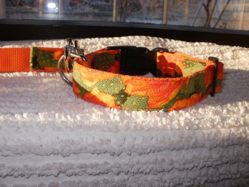 Matchende line og halsbånd i kraftig webbing med Hawai-agtigt mønster, 2,5 cm brede, line 95cm lang, halsbånd 32 – 41 cm, samlet 105.-