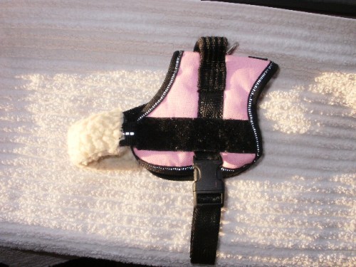 1 Puppia ‘lædervest’ -sele med blødt teddybearfoer, str. L, passer Toasty og Beans, 125.-