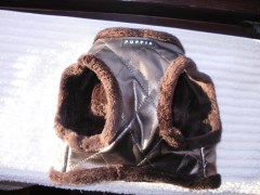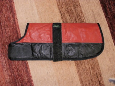 Foret, varm læder’frakke’ i rødt og sort, str. 40 cm. passer til større cavalier, 65.-